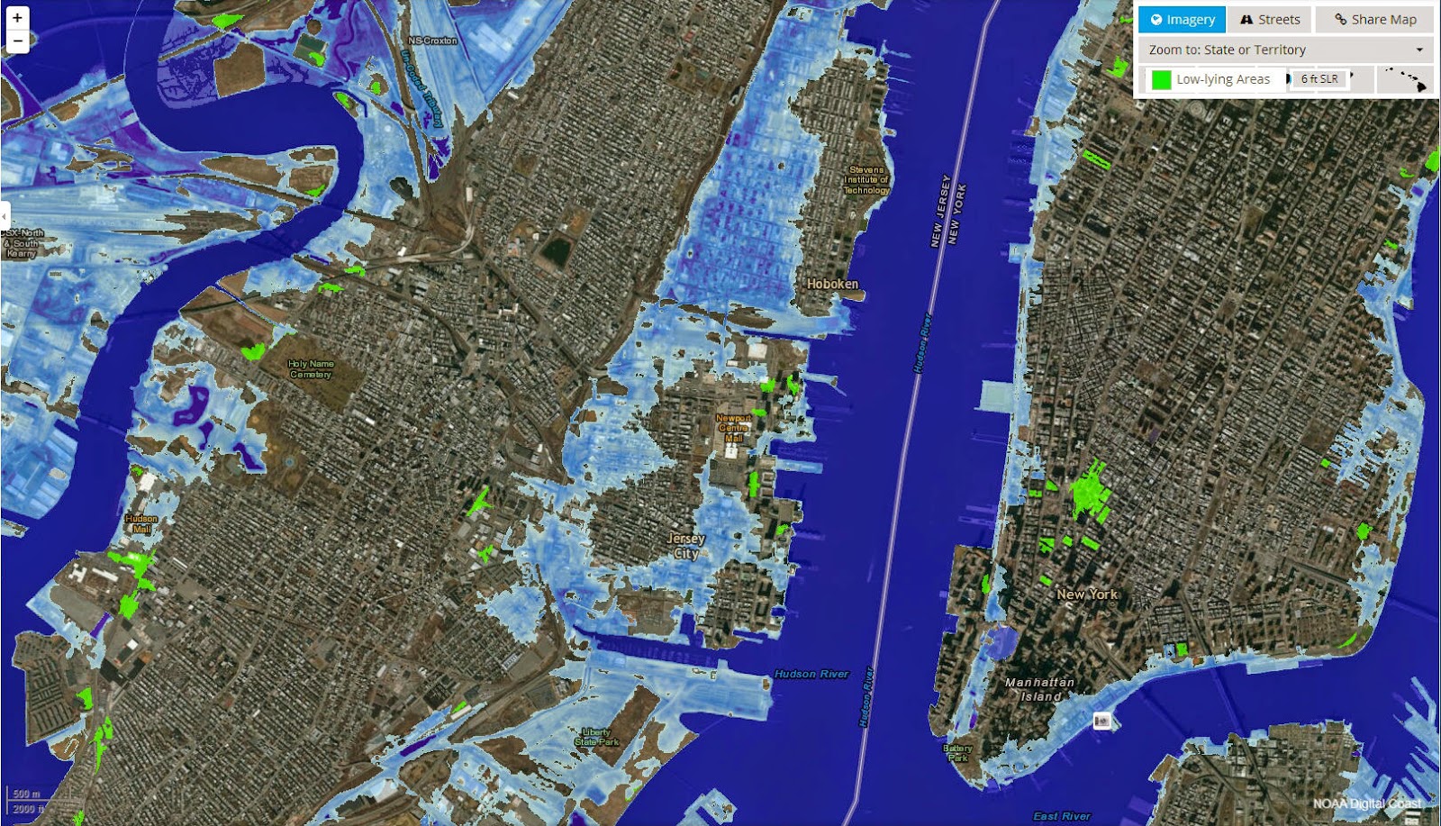 The image below gives an idea of what a sea level rise of six feet (1.829 m) would do to the City of New York. Of course, this is only the sea level rise. Storm surge would come on top of this, as discussed at Ten Dangers of Global Warming.